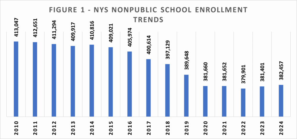In October 2024, New York nonpublic school enrollment was 382,457 – a slight increase of 1,056 (+0.28%) from the previous year’s enrollment of 382,401.