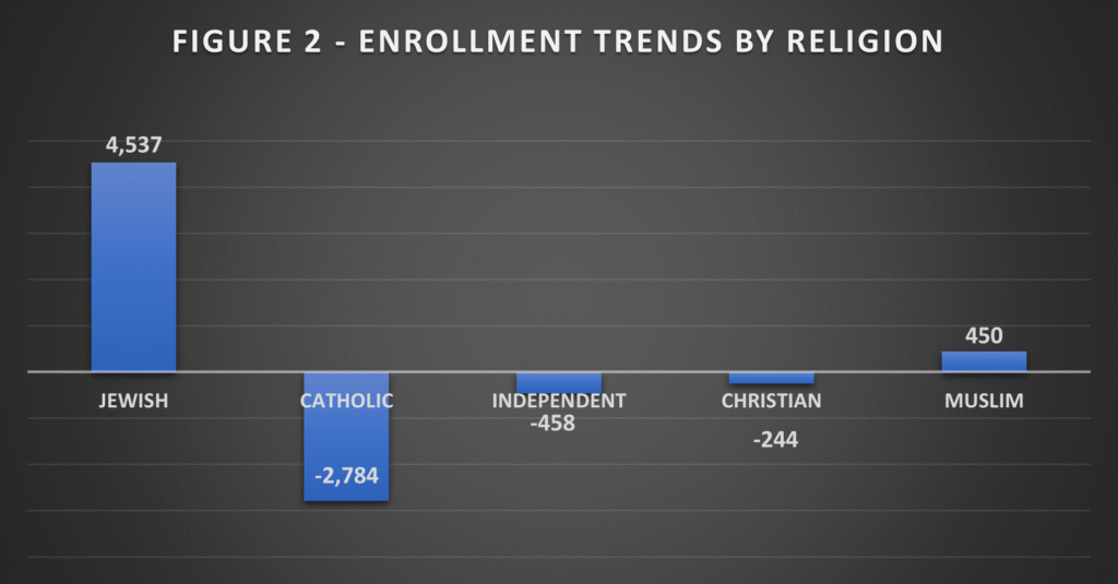 Yeshivish Schools – defined as Orthodox schools where students are gender-segregated – saw slight enrollment growth, with an additional enrollment of 451 students (+0.9%).