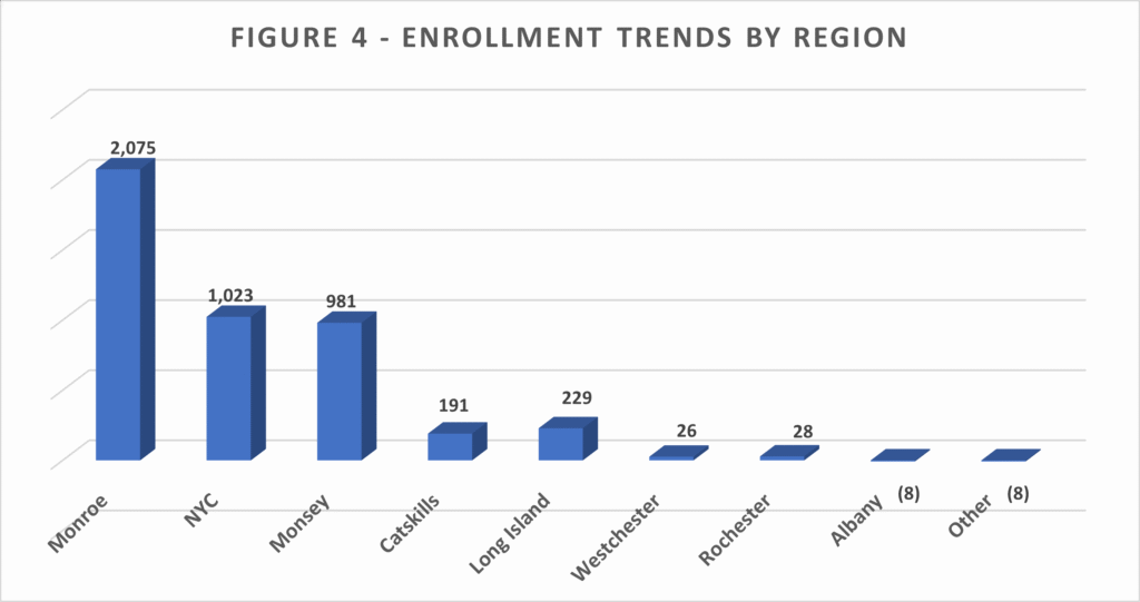 Growth in Jewish schools was concentrated in Monroe (+2,075, +12.6%); New York City (+1,023, +1.0%); and Monsey (+981, +2.8%). Some growth was also seen in Catskills (+191, +18.4%); Long Island (+229, +2.7%); Westchester (+26, +1.3%); and Rochester (+28, +12.6%).